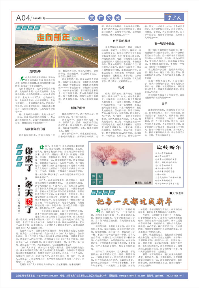 你來(lái)了,冬天暖了!在心靈深處最柔軟的地方,劃過(guò)淺淺地,淡淡地痕跡,那么甜,那么美。像極了初戀的少女,羞澀而又期盼著你的到來(lái)。伸開(kāi)手,擁抱每一篇文字,凝視每一張圖片,拜讀每一篇新聞報(bào)道,發(fā)芽,開(kāi)花,結(jié)果……我一直期待某一天,能夠看你的容顏,感受你的溫度,能夠透過(guò)你去看京廣人的精神文化。我一直很好奇,是什么讓京廣走得越來(lái)越好?是什么可以讓站點(diǎn)之間可以這樣團(tuán)結(jié)?又是什么可以讓總部一次又一次改革,而且每一