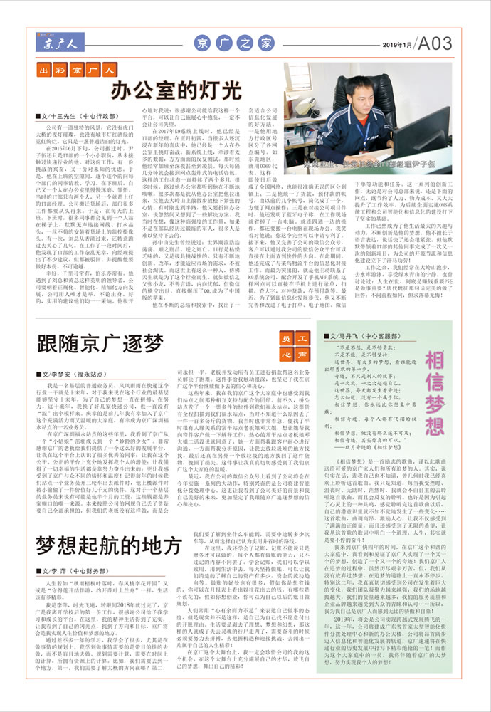 新年的第一縷陽(yáng)光普照大地,我們京廣人感受著2019年的溫暖。伴隨溫暖而來(lái)的,是我們打造企業(yè)文化的《京廣人》報(bào)出刊啦!從今天開(kāi)始,我們京廣人擁有了自己的報(bào)紙,擁有了自己的傳媒,擁有了敞開(kāi)心扉的文化平臺(tái)!不管是城市高樓玉宇,還是鄉(xiāng)間曲折小道,我們京廣人一直奮力奔跑,競(jìng)相傳遞“我為人人,人人為我”的經(jīng)營(yíng)理念。這是溫情感染。這是溫暖交融。溫暖產(chǎn)生磅礴力量,溫暖煥發(fā)勃勃生機(jī)。因?yàn)槲覀冃睦镅b著“呵護(hù)好每份快件