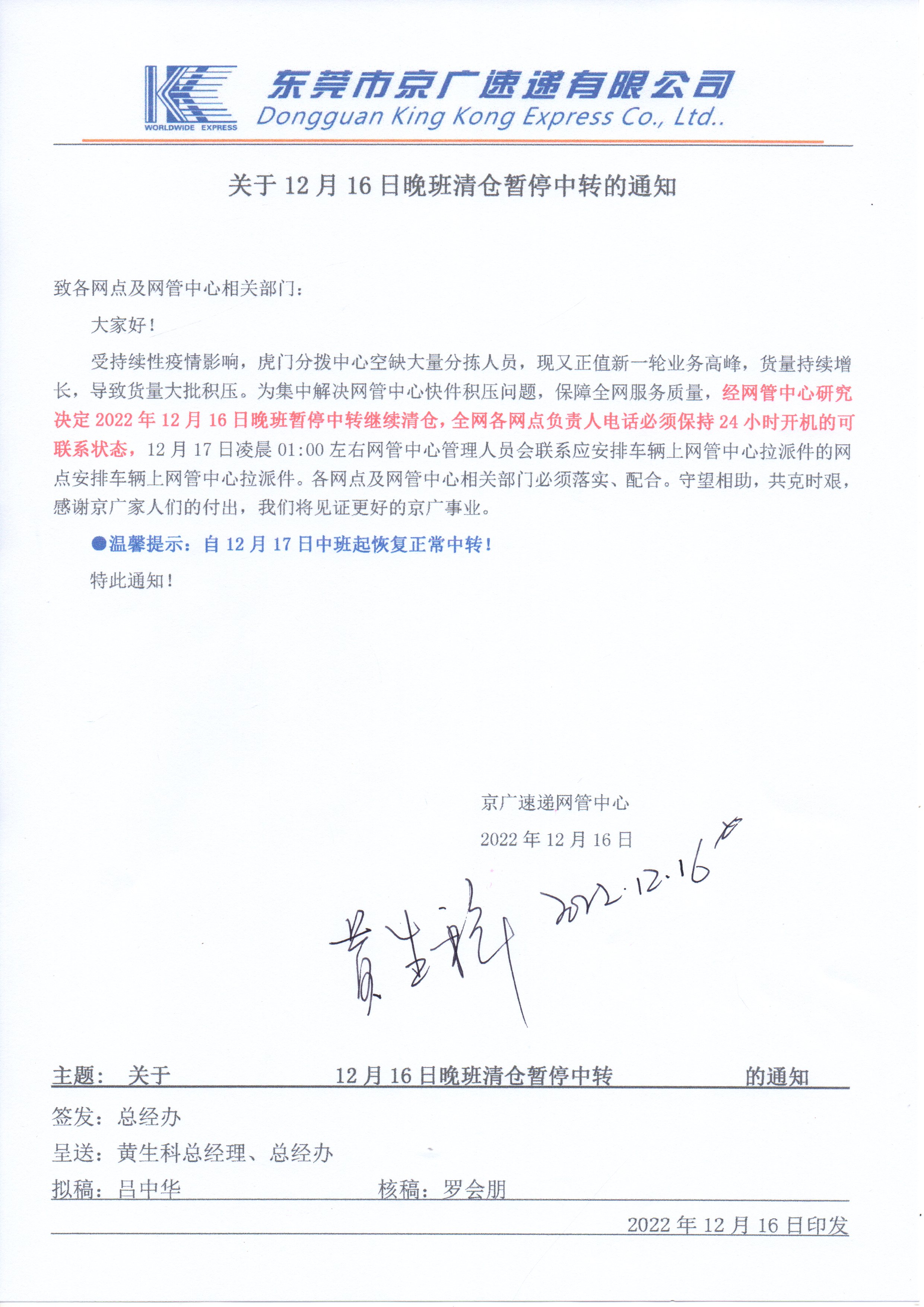 關(guān)于12月16日晚班清倉(cāng)暫停中轉(zhuǎn)的通知